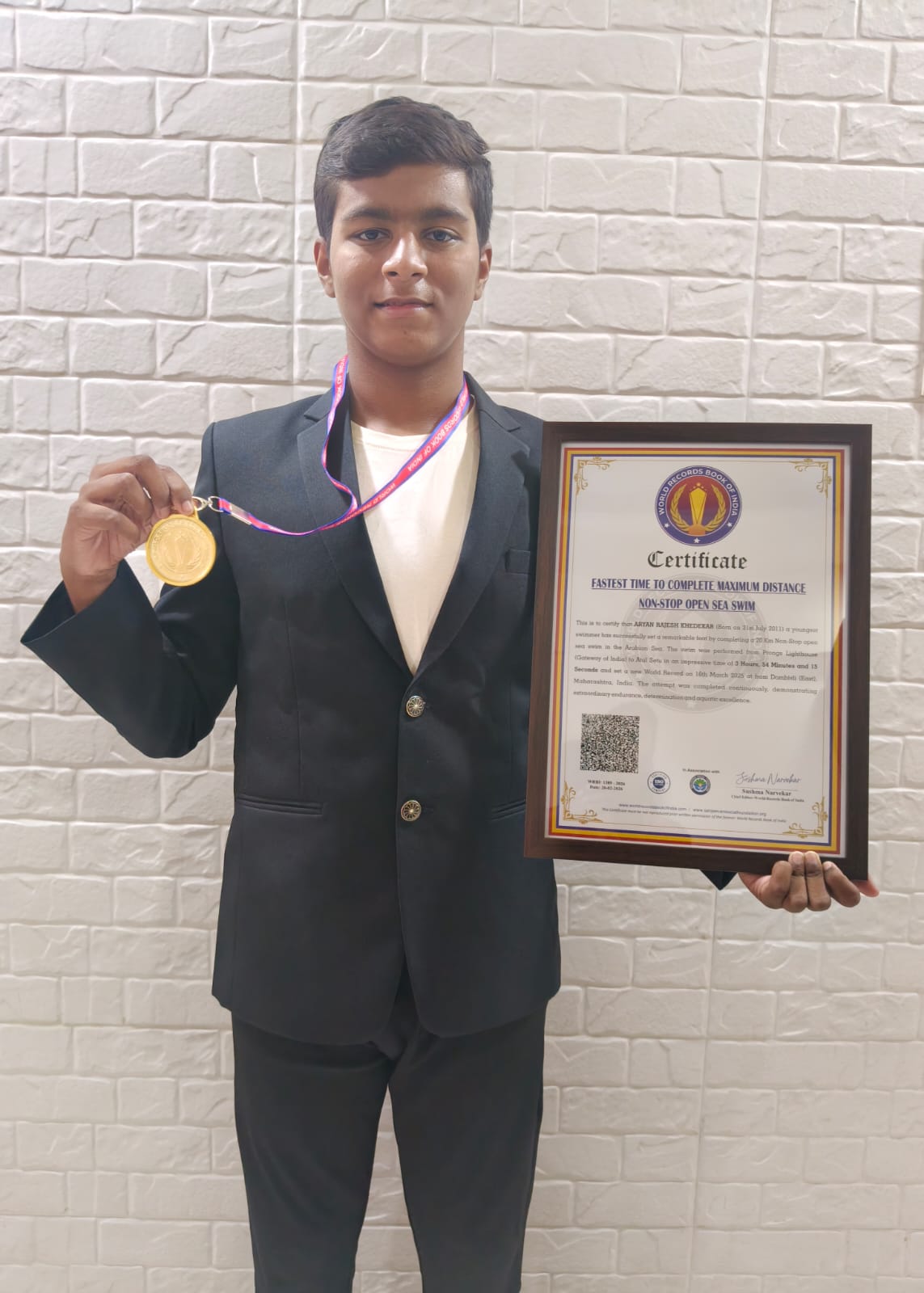 This is to certify that ARYAN RAJESH KHEDEKAR (Born on 31st July 2011) a youngest swimmer has successfully set a remarkable feat by completing a 20 Km Non-Stop open sea swim in the Arabian Sea. The swim was performed from Prongs Lighthouse (Gateway of India) to Atal Setu in an impressive time of 3 Hours, 54 Minutes and 15 Seconds and set a new World Record on 16th March 2025 at from Dombivli (East), Maharashtra, India. The attempt was completed continuously, demonstrating extraordinary endurance, determination and aquatic excellence.